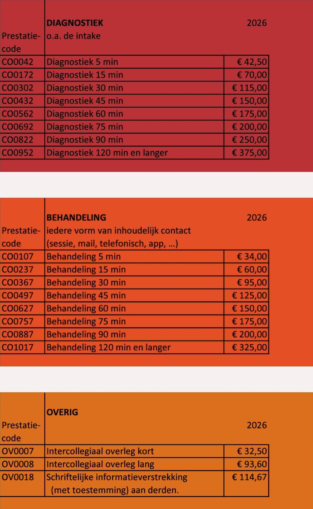 De volgende tarieven gelden in 2026 voor de individuele behandelingen: